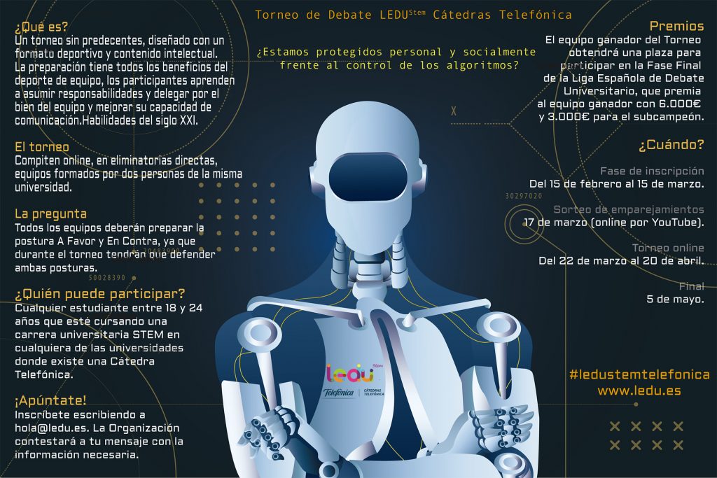 Los equipos debatirán sobre la pregunta ¿Estamos protegidos personal y socialmente frente al control de los algoritmos? La postura que defenderá cada equipo en la final será sorteada a la finalización de la fase competición.