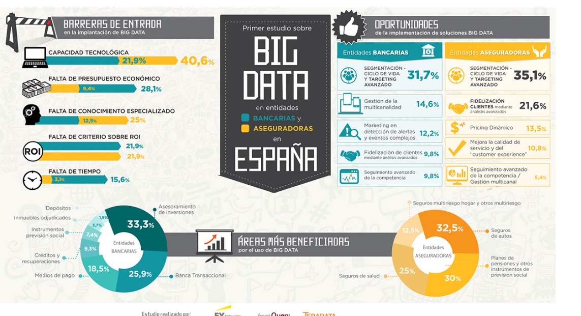 Empresas de todos los sectores ya utilizan este conjunto de tecnologías para analizar grandes cantidades de datos que se generan de forma rápida y constante. Por ejemplo, alrededor del 30% de las compañías del sector financiero en España aprovechan ya el big data, según un informe de la firma de servicios profesionales Ernst & Young (EY).