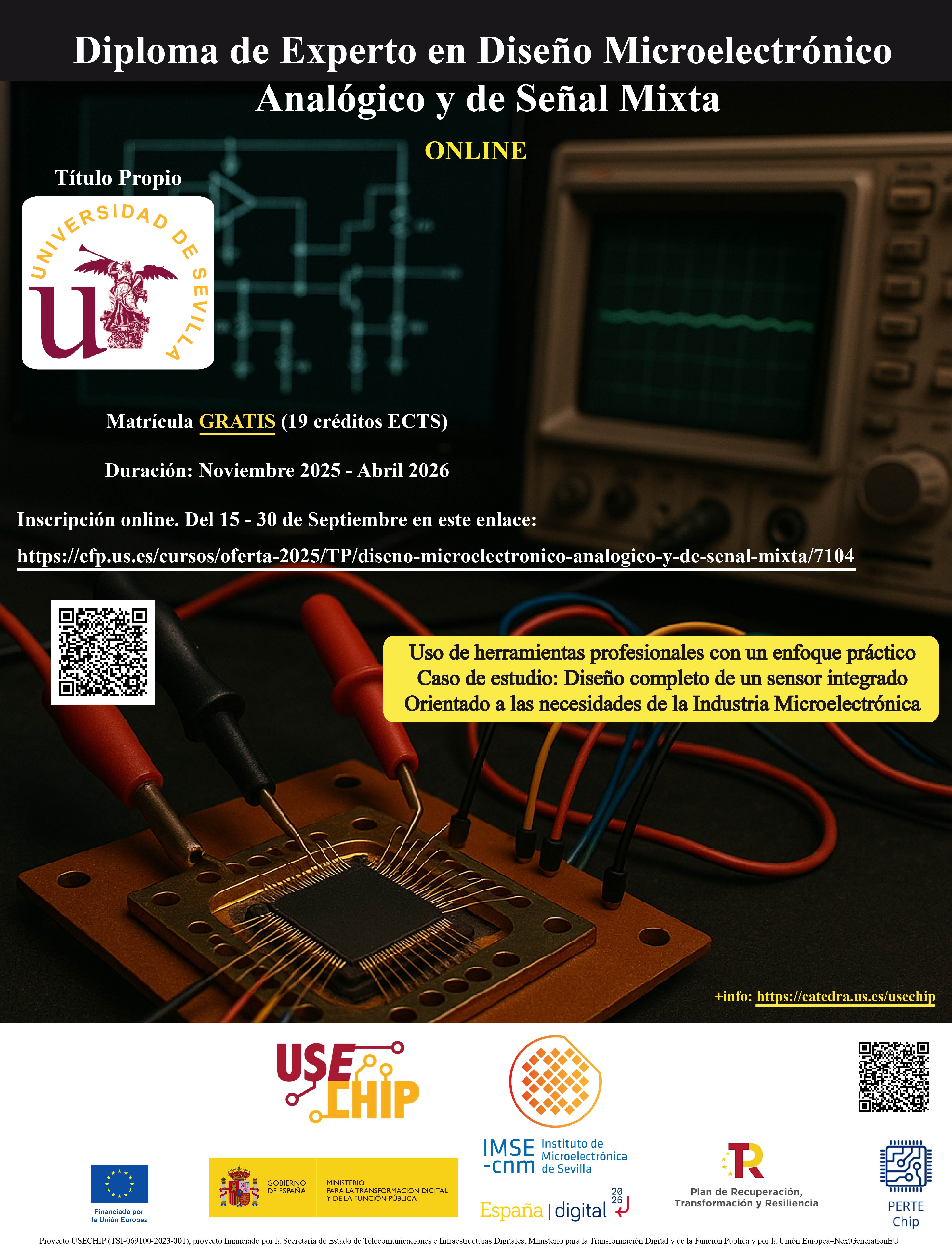 El objetivo fundamental de este título eminentemente práctico es el aprendizaje del diseño de sistemas microelectrónicos analógicos y de señal mixta en un entorno de trabajo profesional. El curso hará énfasis en el diseño de circuitos analógicos integrados, contemplando la posibilidad de que estos módulos analógicos interactúen con bloques digitales de control, procesado y adquisición de datos. Se contempla un caso de estudio transversal, la integración de un sensor, que servirá de hilo conductor a través de todos los bloques de contenidos. El alumno recorrerá durante el curso el flujo de diseño de circuitos integrados y aprenderá los pasos para validar el diseño de un sensor integrado antes de ser fabricado. Se irán alternando sesiones de teoría con sesiones de laboratorio donde se pondrán en práctica los conocimientos adquiridos.